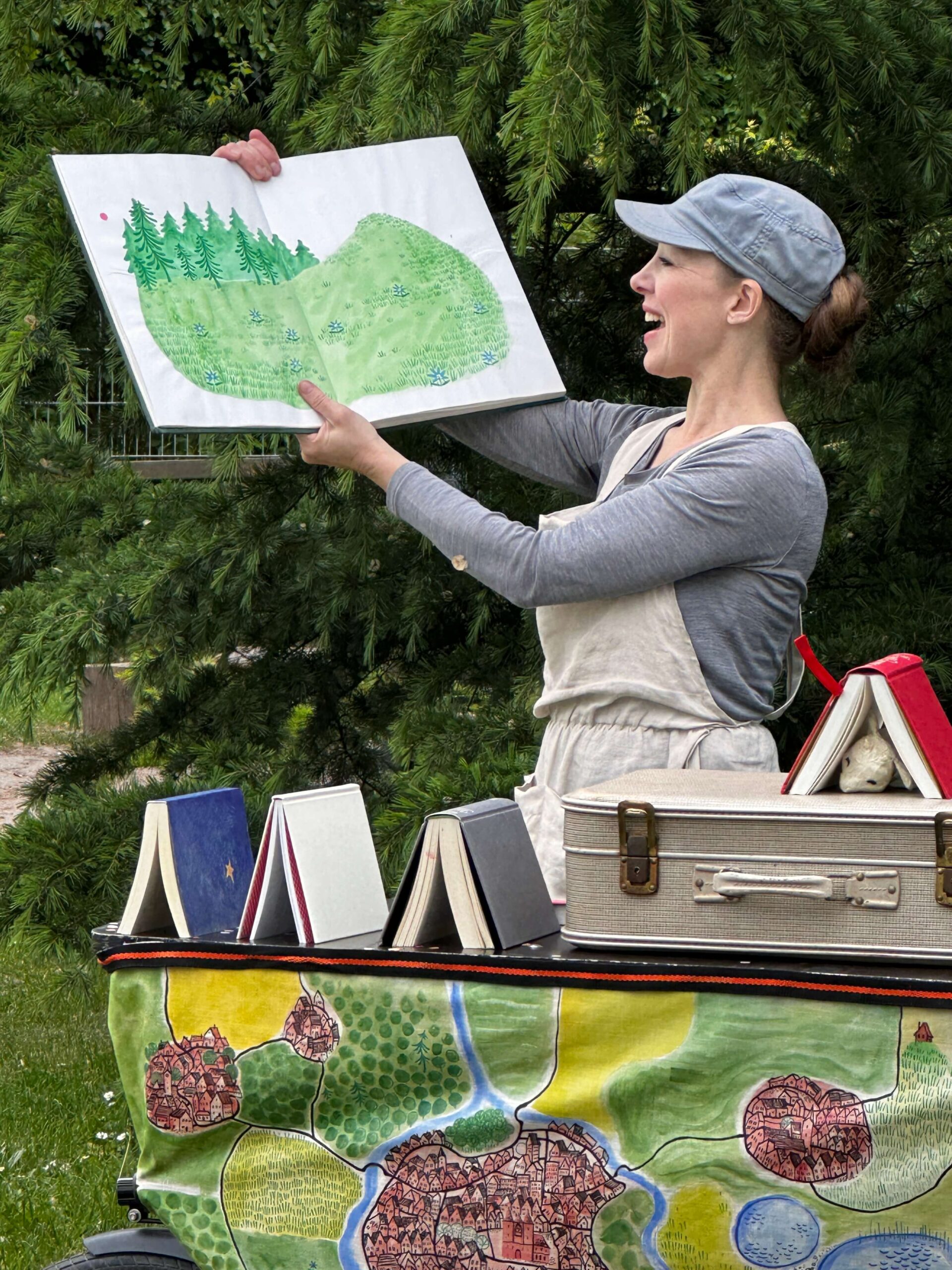 Das Fahrrad-Theater hat Bücher geladen, denn in Büchern sind Geschichten verborgen. In ihnen können sie reisen. Figuren schlüpfen daraus hervor und erkunden die Welt.
